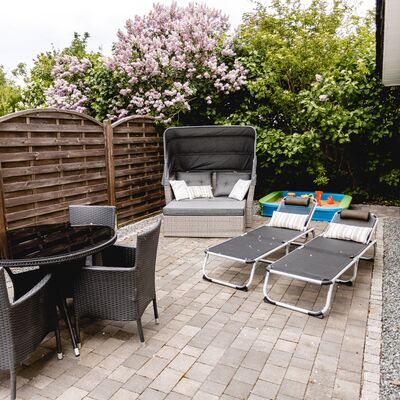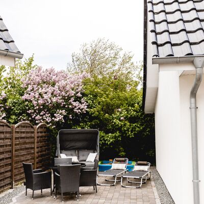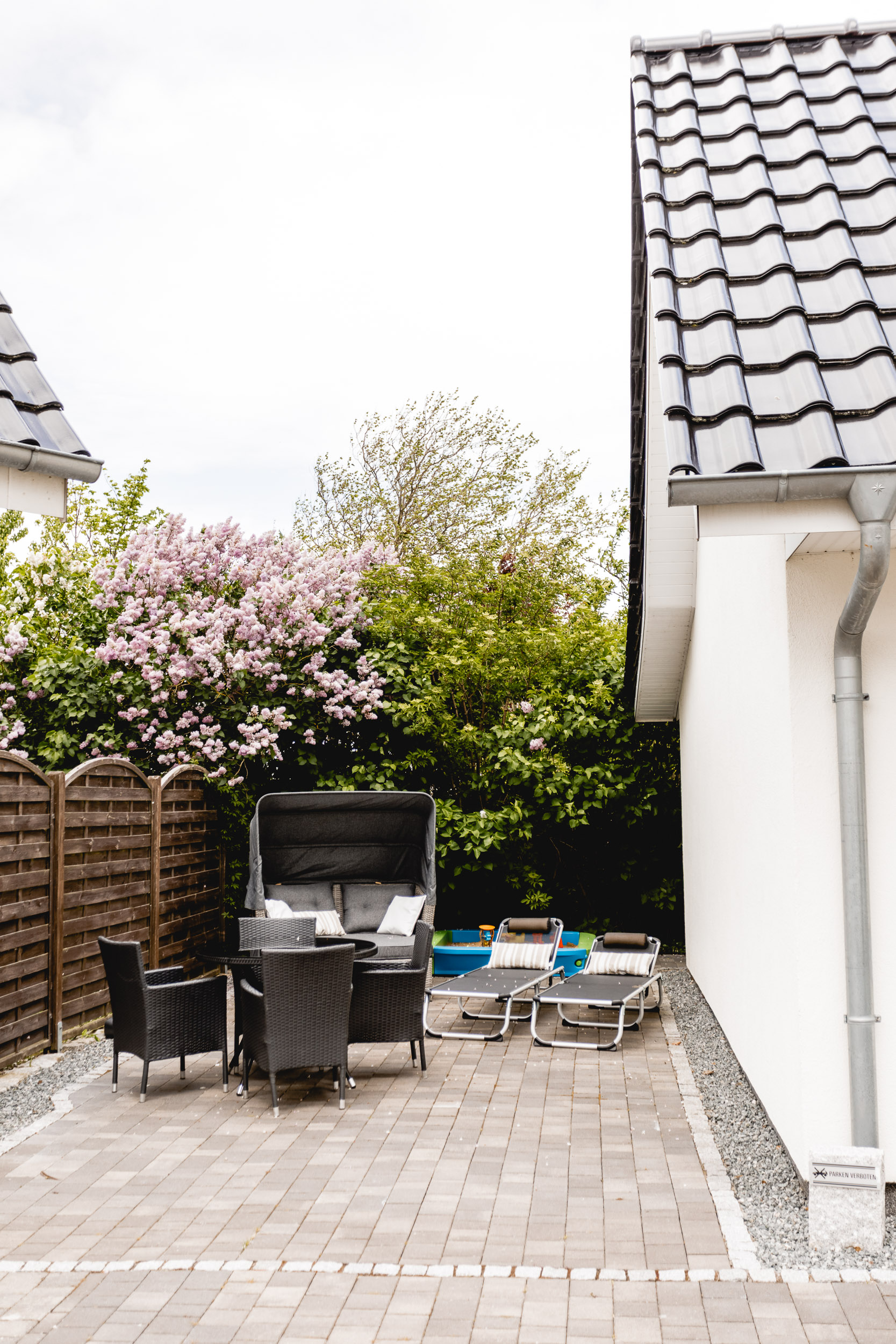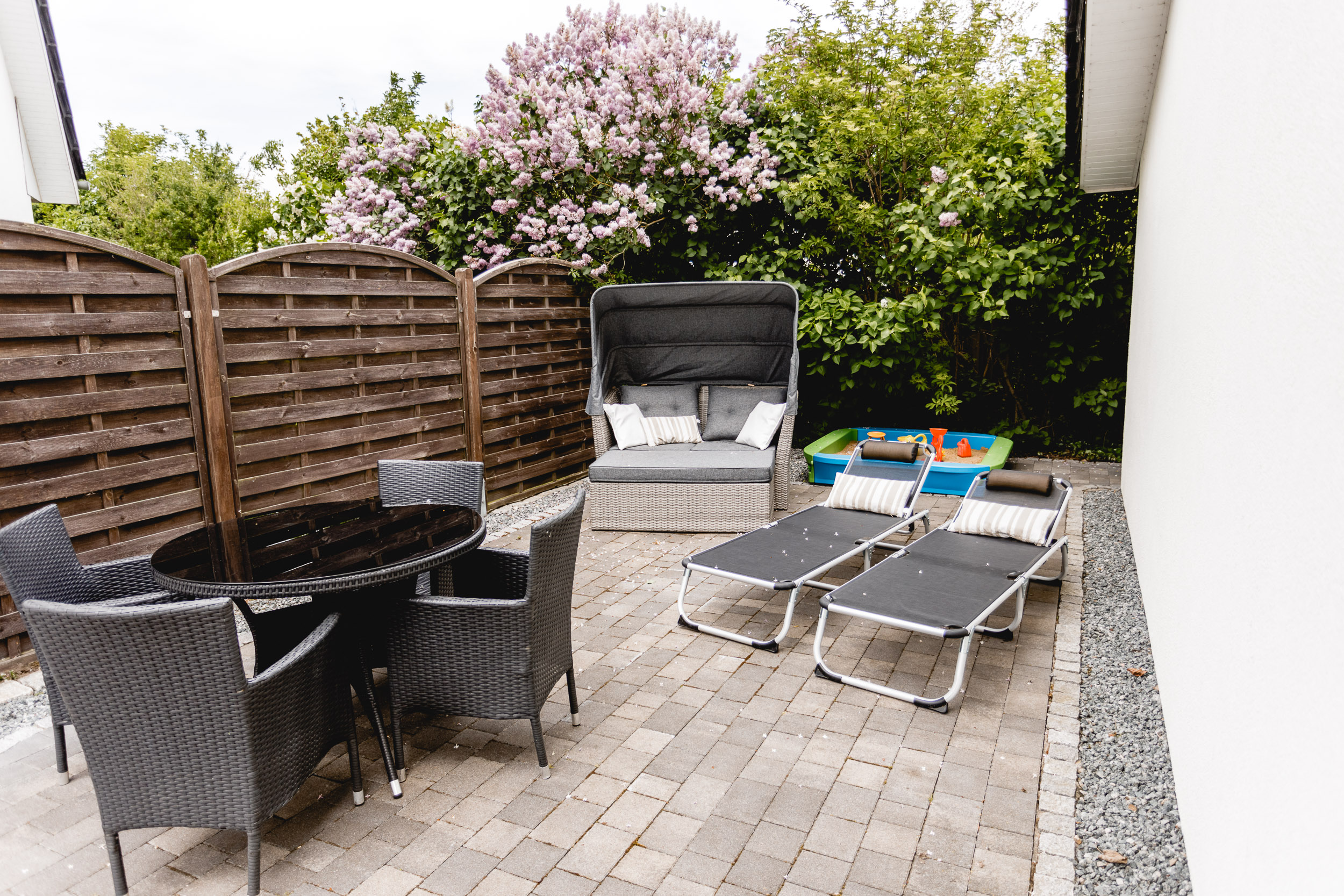 Die Terrasse wurde neu angelegt und möbliert. Die Sitzecke lädt hier zur Entspannung ein.